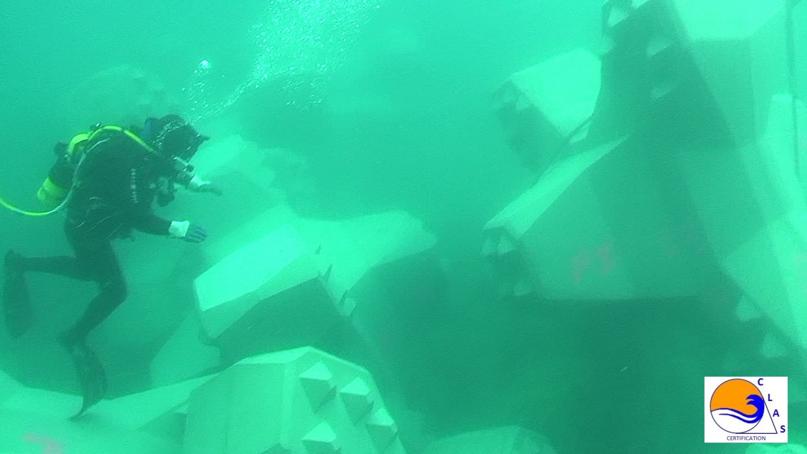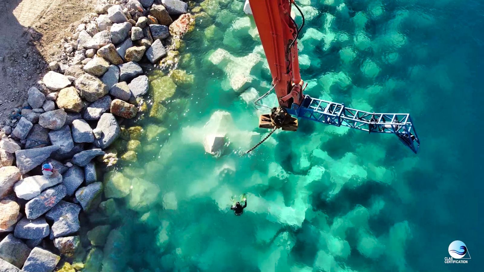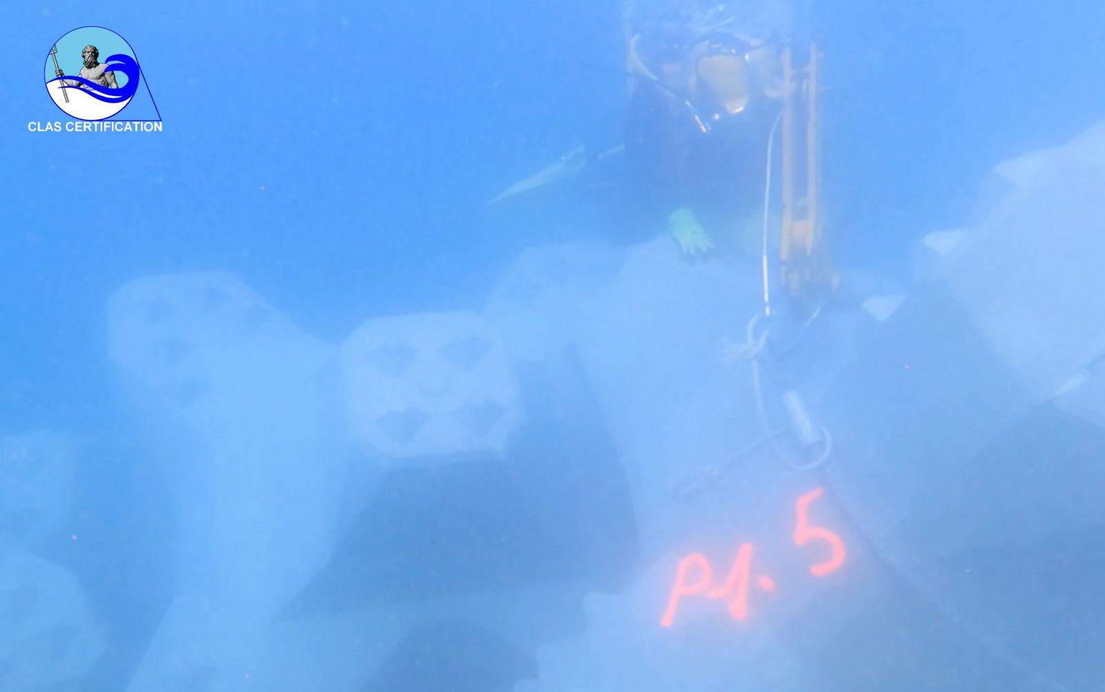 El "buceador experimentado" es en realidad la empresa IDMer, ahora CLAS, que trajo un equipo de colocación. Organizamos el sitio y llevamos a cabo la instalación de los bloques ACCROPODE™II nosotros mismos en un tiempo récord.