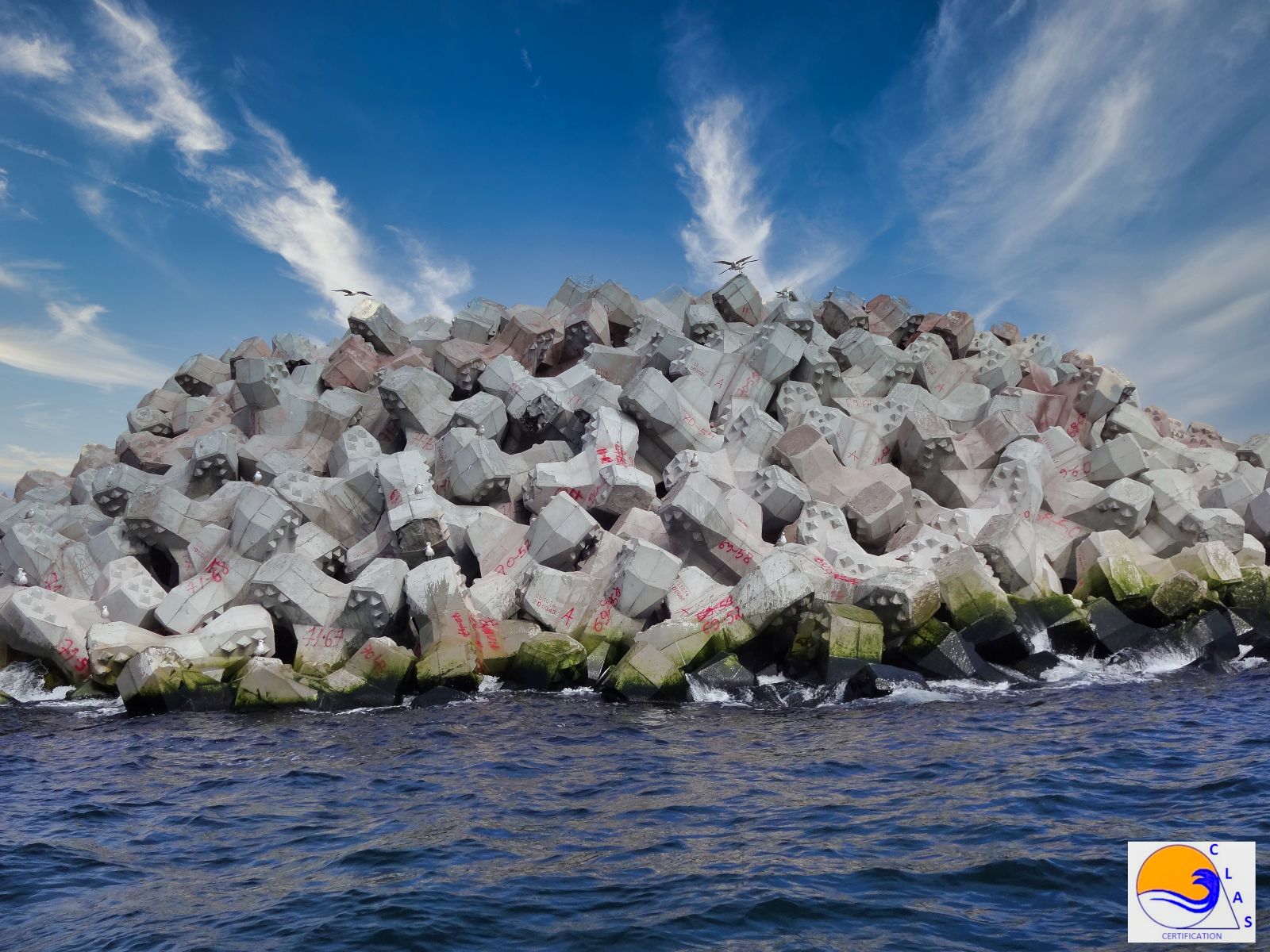 Normalmente se debe desmontar la zona y colocar correctamente estos ACCROPODE™II, respetando la malla de tendido y el fuerte apoyo con los ACCROPODE™II de la fila inferior. CLAS tiene el saber hacer que hace posible resolver este tipo de no conformidades sin desmantelar el ACCROPODE™II anterior en la mayoría de los casos.