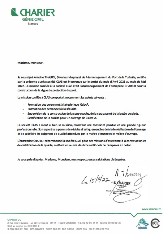 Le chantier a été livré dans les délais et la carapace en X-bloc ® réceptionnée sans réserve et certifiée digue de CLASSE A.