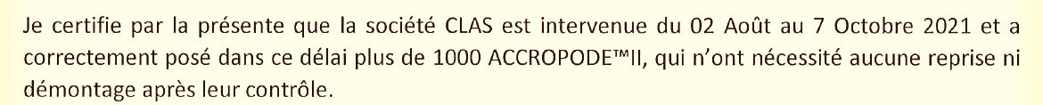 Vous trouverez sur les sites internet des vendeurs d’outils de pose qui « garantissent » une pose sans démontage, alors que nous constatons des démontages de plus de 50% des blocs ACCROPODE™II ou Xbloc® posés sur certains projets… Ce n’est pas CLAS qui affirme que notre pose ne nécessite pas de démontages après contrôle par le client, ce sont nos clients eux-mêmes qui le certifient, comme par exemple le Directeur de Projet de la société BOUYGUES, en charge de la construction des digues de Port La Nouvelle, mettant en œuvre des blocs ACCROPODE™II et qui écrit au sujet de CLAS :