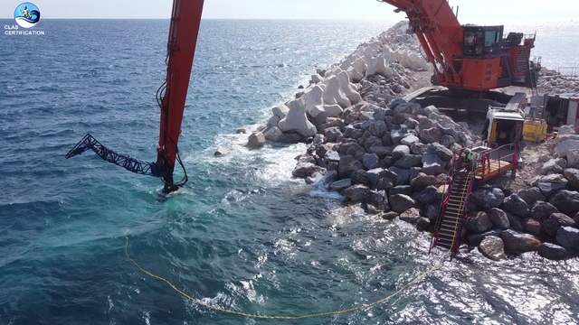 Nous gérons tous les aspects de la pose des blocs de carapaces de digues, en commençant par le réglage ponctuel et la validation du tapis de pieds et de la sous-couche. La surface de pose des blocs de carapace fait l’objet d’un rapport d’inspection établi visuellement et souvent filmé, qui confirme que la granulométrie des enrochements est conforme aux coupes types du projet. Nous confirmons que la rugosité de la sous-couche autorise la pose des blocs de carapace. Nous établissons le rapport d’inspection.
