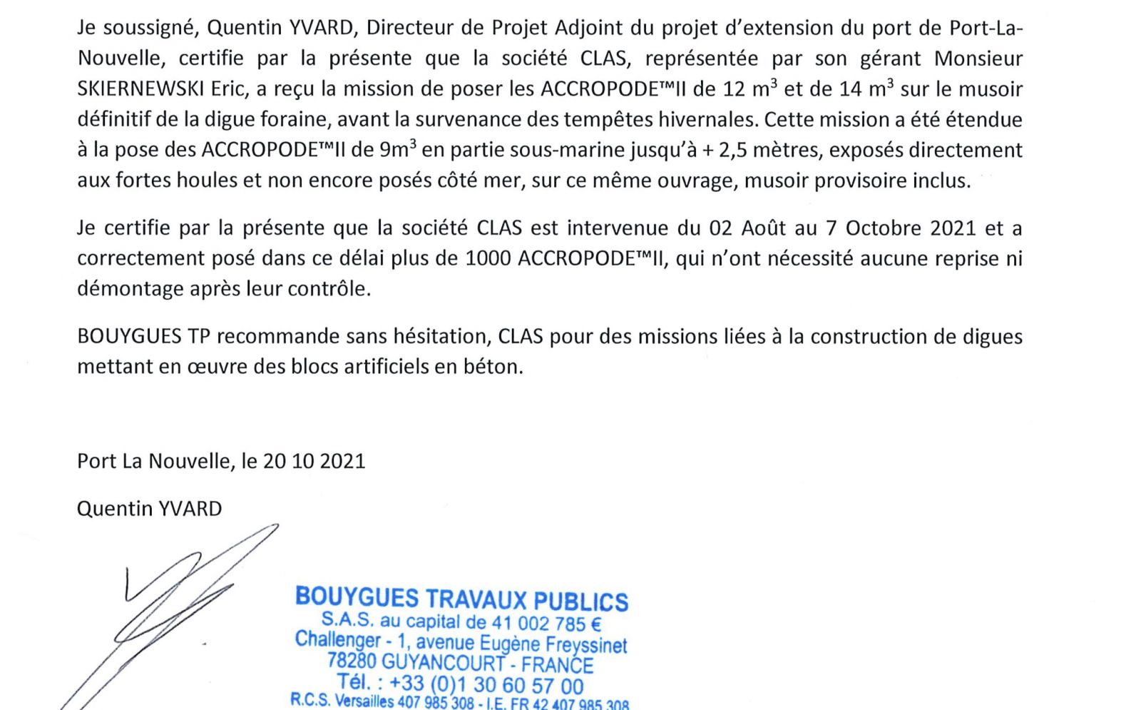 «Ce chantier très mal engagé s’est terminé en donnant pleine satisfaction et nous sommes revenus sur notre avis négatif au sujet des ACCROPODE™. Tant que nous bénéficierons d’une efficacité et d’une qualité de ce niveau, nous n’hésiterons pas à proposer l’ACCROPODE™II en variante pour les projets futurs.
