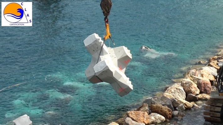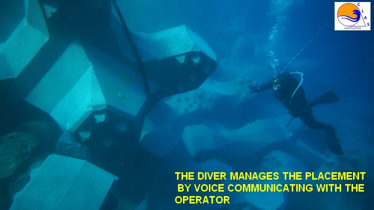 La production moyenne en pose à la grue à câble avec plongeurs formés par CLAS est de 6 à 8 ACCROPODE™II par heure, approuvés.
