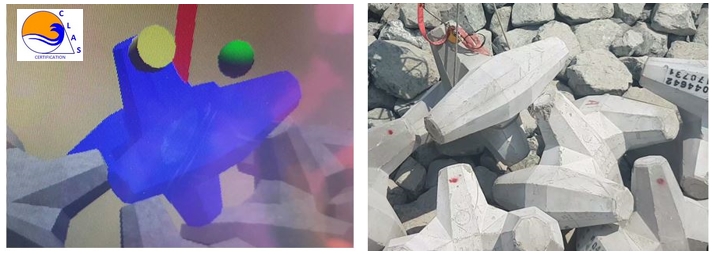 Normalement la zone montée en colonnes devrait être démontée et ces ACCROPODE™II correctement positionnés en respectant la maille de pose. CLAS dispose d’un savoir-faire qui permet de régler ce type de non-conformité sans démonter les ACCROPODE™II au-dessus, dans la majorité des cas.