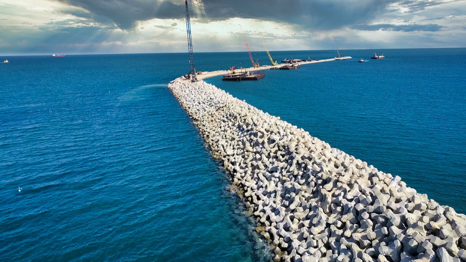 Nous avons également été chargé de construire rapidement la carapace de la digue Sud mettant en oeuvre des blocs ACCROPODE™II et ECOPODE™. En tout plus de deux mille blocs ont été posés et approuvés sans démontage par la maîtrise d'oeuvre ARTELIA.