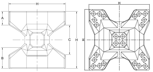 L’ACCROPODE™II se distingue de l’ACCROPODE™ de première génération par la suppression des enclumes et la diminution de l’épaisseur de béton entre les pattes.