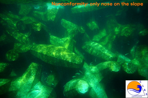Les contacts avec les CORELOC du rang inférieur doivent être établis avec des appuis solides. Le principal obstacle à cette bonne imbrication est dû à l’accrochage du CORELOC sur les enrochements de la sous-couche qui arrêtent le mouvement à descendre du bloc. Le seul moyen de s’affranchir de ce problème constant est de s’assurer visuellement que le bloc est dans sa position finale d’imbrication. Dans environ 40% des cas, une pose naturelle conduira à une mauvaise imbrication et le CORELOC ainsi posé aura encore la possibilité de descendre encore sous l’action de son poids et/ou de la mer.