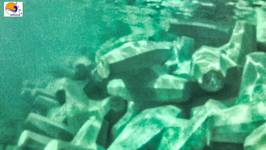 Visibilité : une bonne visibilité facilitera les opérations de contrôle visuel. L’opérateur doit pouvoir voir la carapace de face, perpendiculairement à la surface du talus, et recevoir l’information sur les points de contacts avec les CORELOC de la rangée inférieure et avec le talus. Seul un plongeur peut mener correctement ces contrôles. En eau claire c’est très rapide, en eau sale c’est plus long et nécessite un apprentissage poussé, notamment à la sécurité.