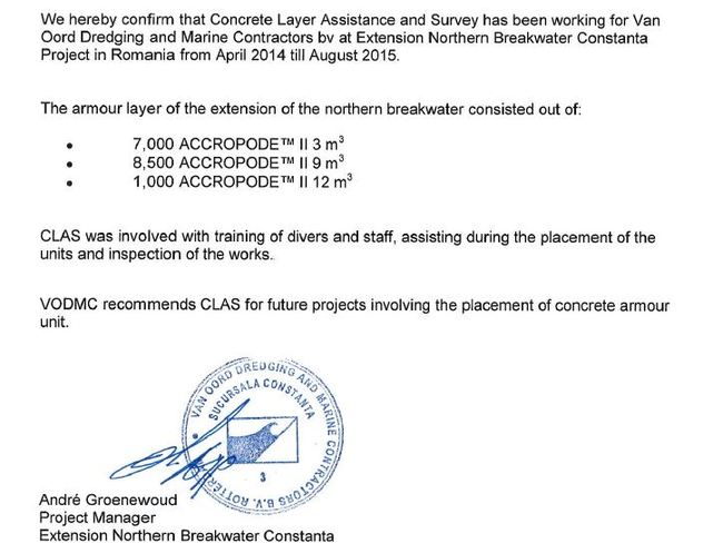 VAN OORD était en charge du projet d'extension du port de CONSTANTA en ROUMANIE avec des ACCROPODETMII. VAN OORD a confié à CLAS la mission de former et superviser les équipes de pose d'ACCROPODETMII et d'atteindre les objectifs de production et de qualité.
